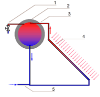 Cold Water enters through a Inlet (5) into an Insulated Storage Tank (2). From there it flows through a Panel (4) which absorbs Solar Radiation (3). The Solar Energy is absorbed as heat and the hot water re-enters the tank where is exchanges heat with the rest of the water through Convection or a heat exchanger. Hot water exits the tank at the top where it is used (1). The temperature at the top of the tank is warmer than that at the bottom because of Convection